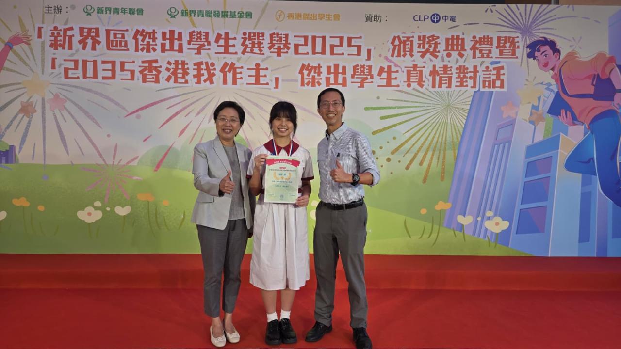 Our F.5 student, Loh Chi Ching, was recommended by the Tuen Mun District Outstanding Students' Association to participate in the New Territories Outstanding Students Election. After undergoing a written examination, a short video competition, and an interview, she was honored with the commendation of "Excellent Student".
