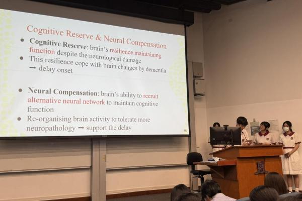 本校中五級湯子賢、蘇靜妍、郭靜霜、吳泳琳及黃靖荷參加由香港中文大學醫學院舉辦的「健康展覽報告比賽」,同學就雙語能力延緩認知障礙症的議題,進行研究及撰寫報告,並向中大醫學院醫生及教授匯報,最終獲得銅獎。