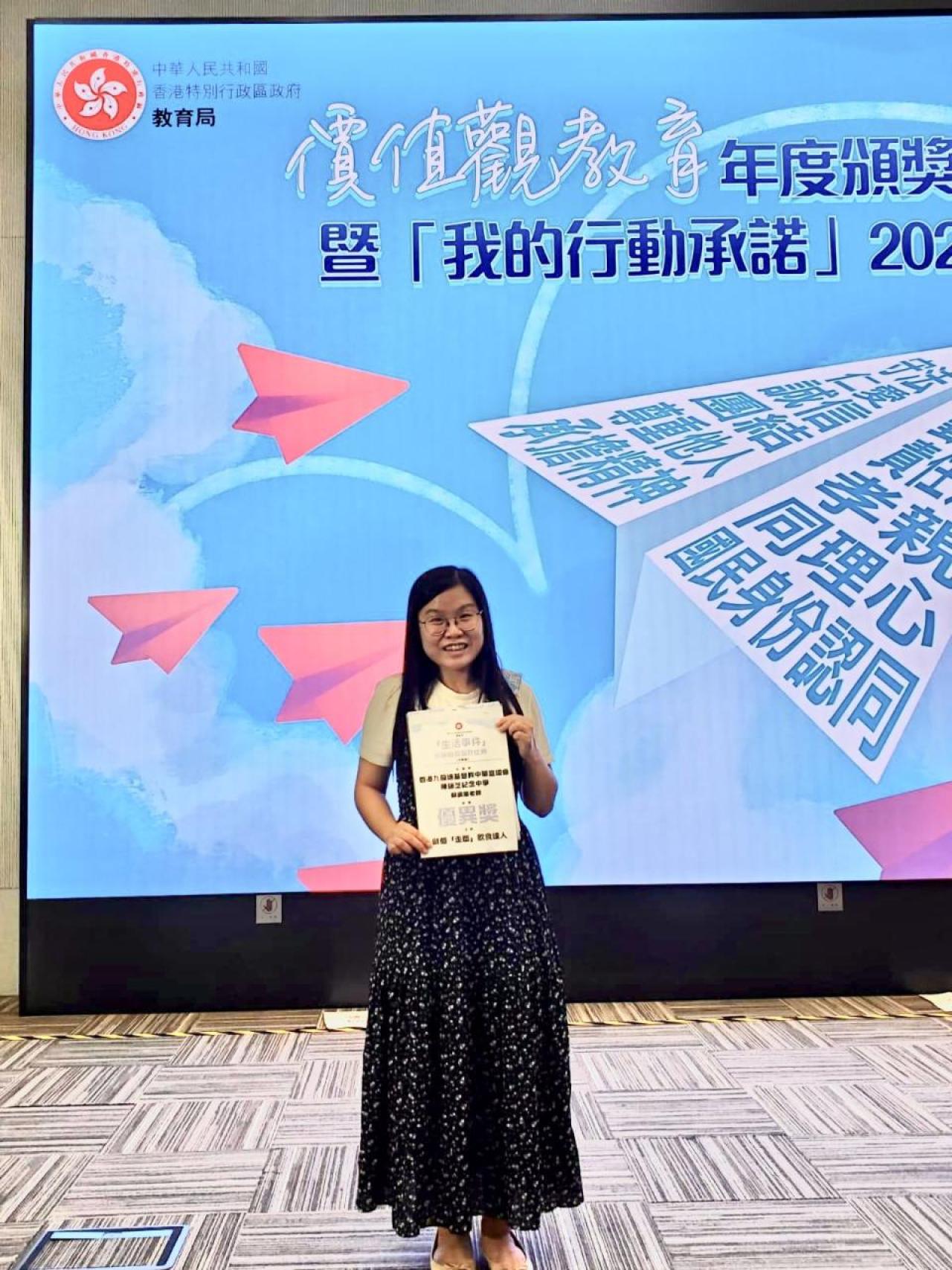 "恭喜本校地理科科主任蔡曉嵐老師早前參加了由教育局課程發展處德育、公民及國民教育組舉辦的「生活事件」教學簡報設計比賽,在中學組賽事中奪得優異獎,得獎作品是「做個走塑達人」,並獲邀出席價值觀教育年度頒獎典禮2023/2024暨「我的行動承諾」2024/25啟動禮。