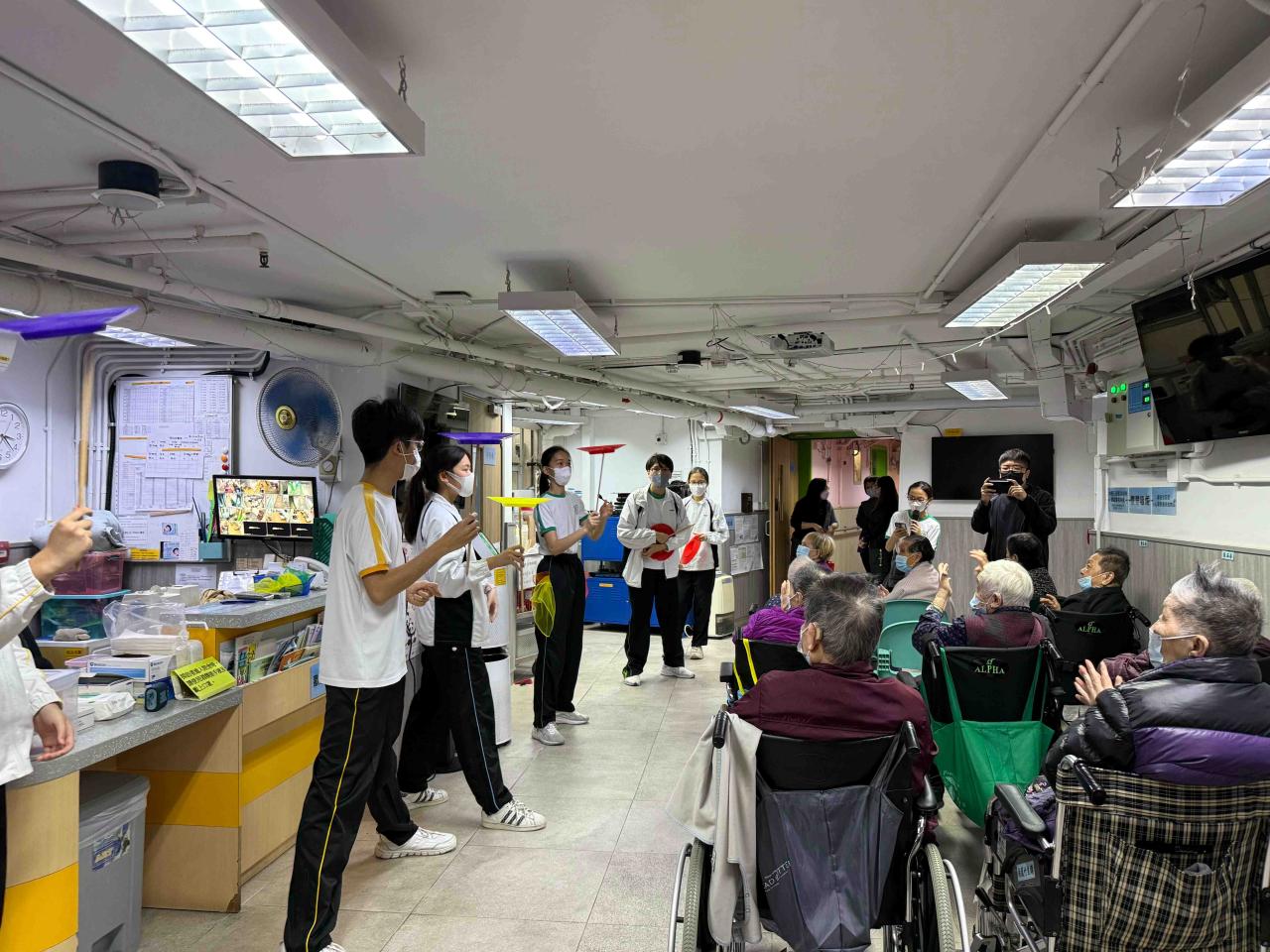 "30位中一至中五同學於二月至三月期間參加了由香港青年協會所舉辦的「社區義工服務學習計劃」,學習了新技能,除了轉盤、拋絲巾等雜技外,更學習到一些魔術表演,獲益良多。同學們更於三月到兩間安老院為「老友記」表演,送上小小心意,為他們的生活增添一點色彩。