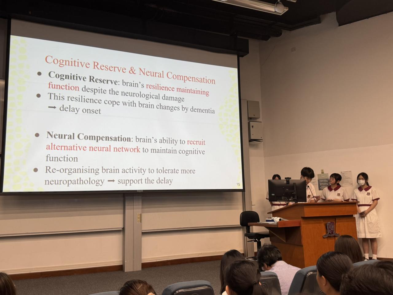 本校中五級湯子賢、蘇靜妍、郭靜霜、吳泳琳及黃靖荷參加由香港中文大學醫學院舉辦的「健康展覽報告比賽」,同學就雙語能力延緩認知障礙症的議題,進行研究及撰寫報告,並向中大醫學院醫生及教授匯報,最終獲得銅獎。